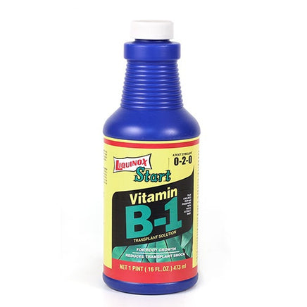 LIQUINOX START with Vitamin B-1 A transplant solution of growth-promoting substances that includes Vitamin B-1, Alpha Naphthalene Acetic Acid (hormonelike substance), Yucca Extract Base, Chelated Iron and Phosphoric Acid. START is especially formulated to help reduce transplant shock and to stimulate feeder root growth. START is an effective transplant shock and to stimulate feeder root growth. START is an effective transplant solution for use on all types of transplants, including bare root roses, shrubs, bedding plants, seedlings and cuttings. Light frequent applications of START will result in good, healthy root structure and successful planting.