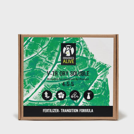 Organics Alive V-TR Dry Soluble Powder is designed for plants transitioning into flower or beginning to set fruit. It has a macronutrients value of 4-5-5 (N-P-K) N (Nitrogen) P (Phosphorus) K (Potassium) which is well balanced and can be used on all perennials, annuals, flowers, fruits, vegetables, and turf.