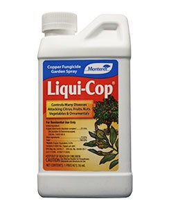 Monterey Liqui-Cop is a copper fungicide garden spray designed to prevent many garden diseases that attack citrus, fruits and nut trees, vegetables and ornamentals. Liqui-Cop is a year round fungicide and can be sprayed up to the day of harvest.